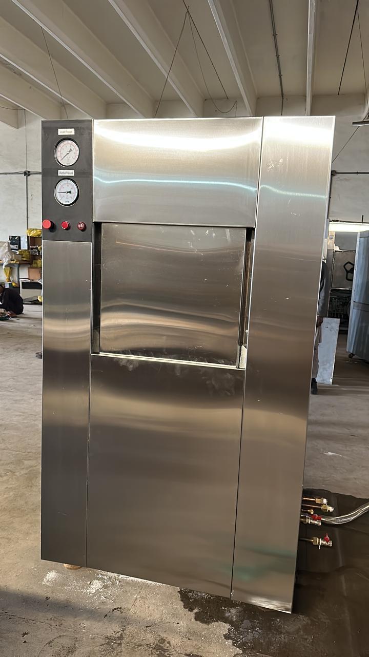 Manual operated single door type. On screen programmable cycles, sterilization time, purging time, dry time etc. Front panel equipped with pressure gauges, microprocessor control panel and thermal printer.